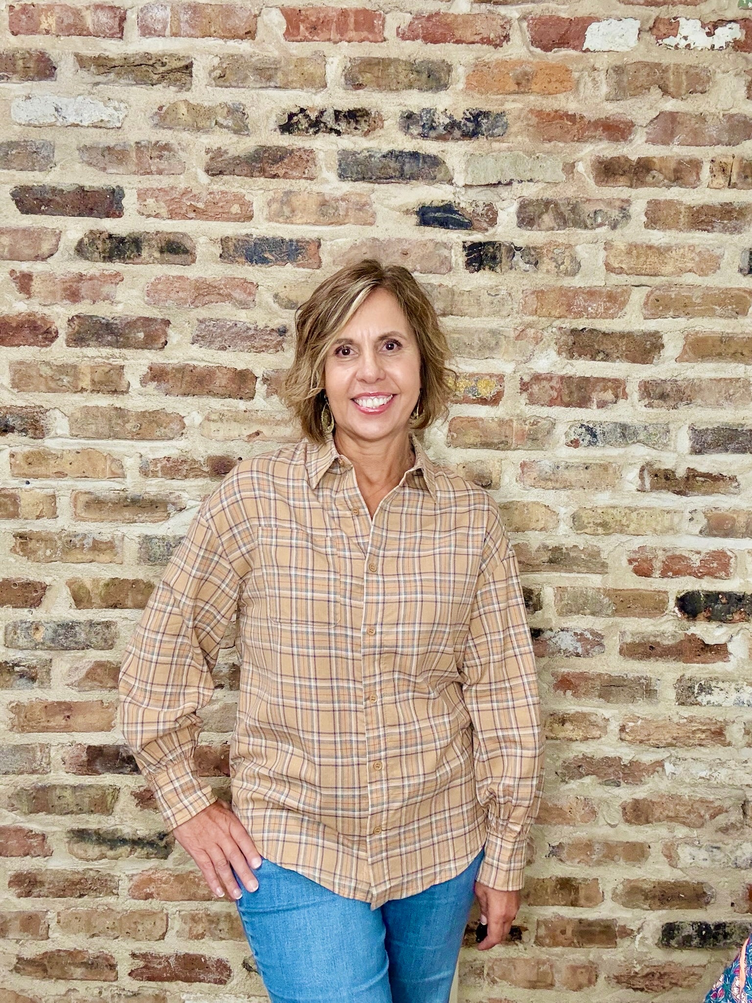 The Dream Button Up is a charming plaid shirt in a warm tan hue, designed with a soft blend fabric that keeps things cozy and cool. With its classic button-down style, it’s perfect for layering or wearing on its own when you want to add a splash of playful pattern to your day.