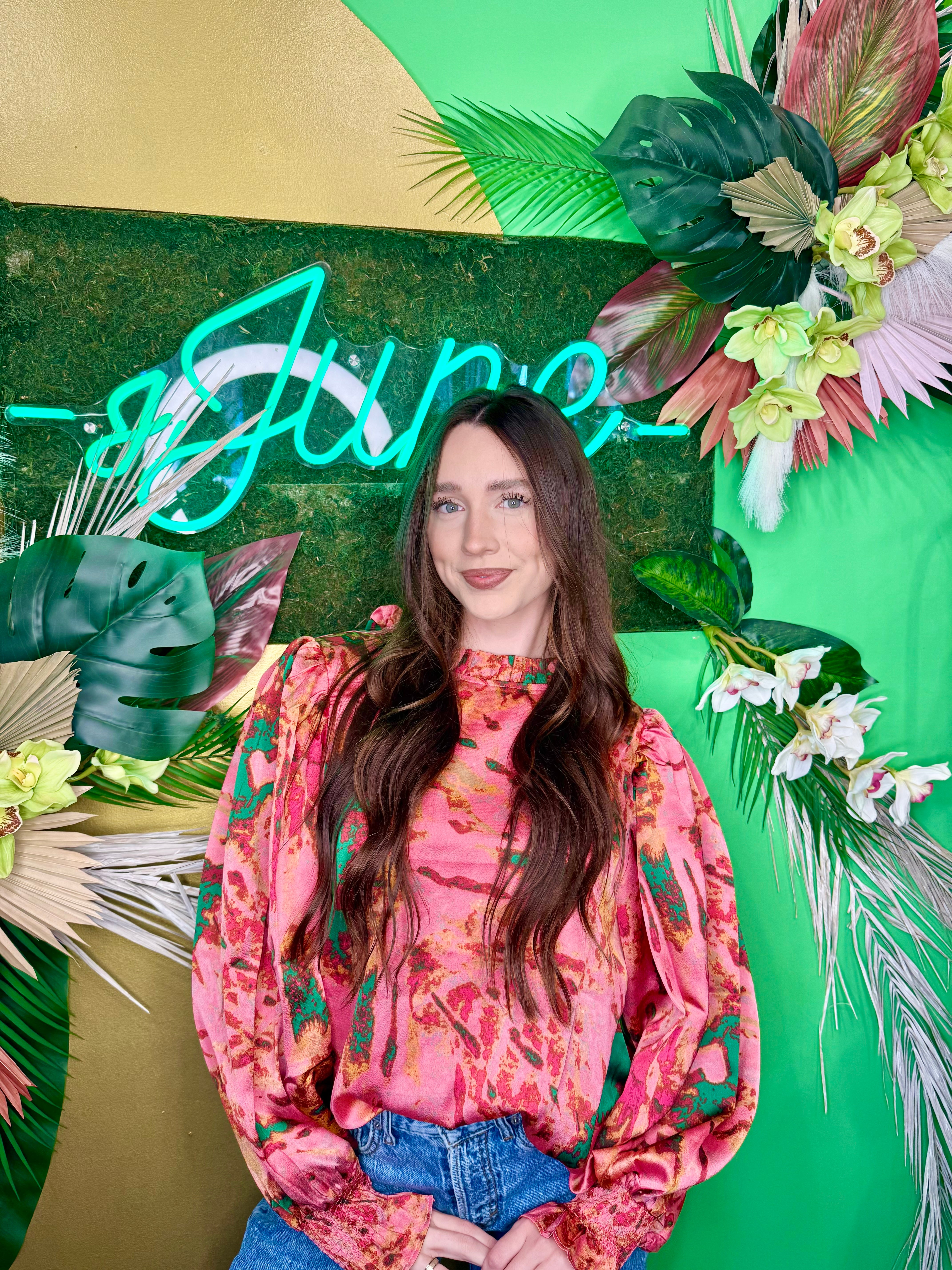 The Larkin Blouse is your go-to piece for adding a splash of artistic flair to any outfit. This stunning dark pink blouse features a dreamy multicolor watercolor design that catches the eye from every angle. Long sleeves are finished with charming ruffles at the cuffs, giving you that perfect balance of elegance and whimsy. Whether you're heading to brunch or a creative gathering, this blouse brings personality and polish to your wardrobe.