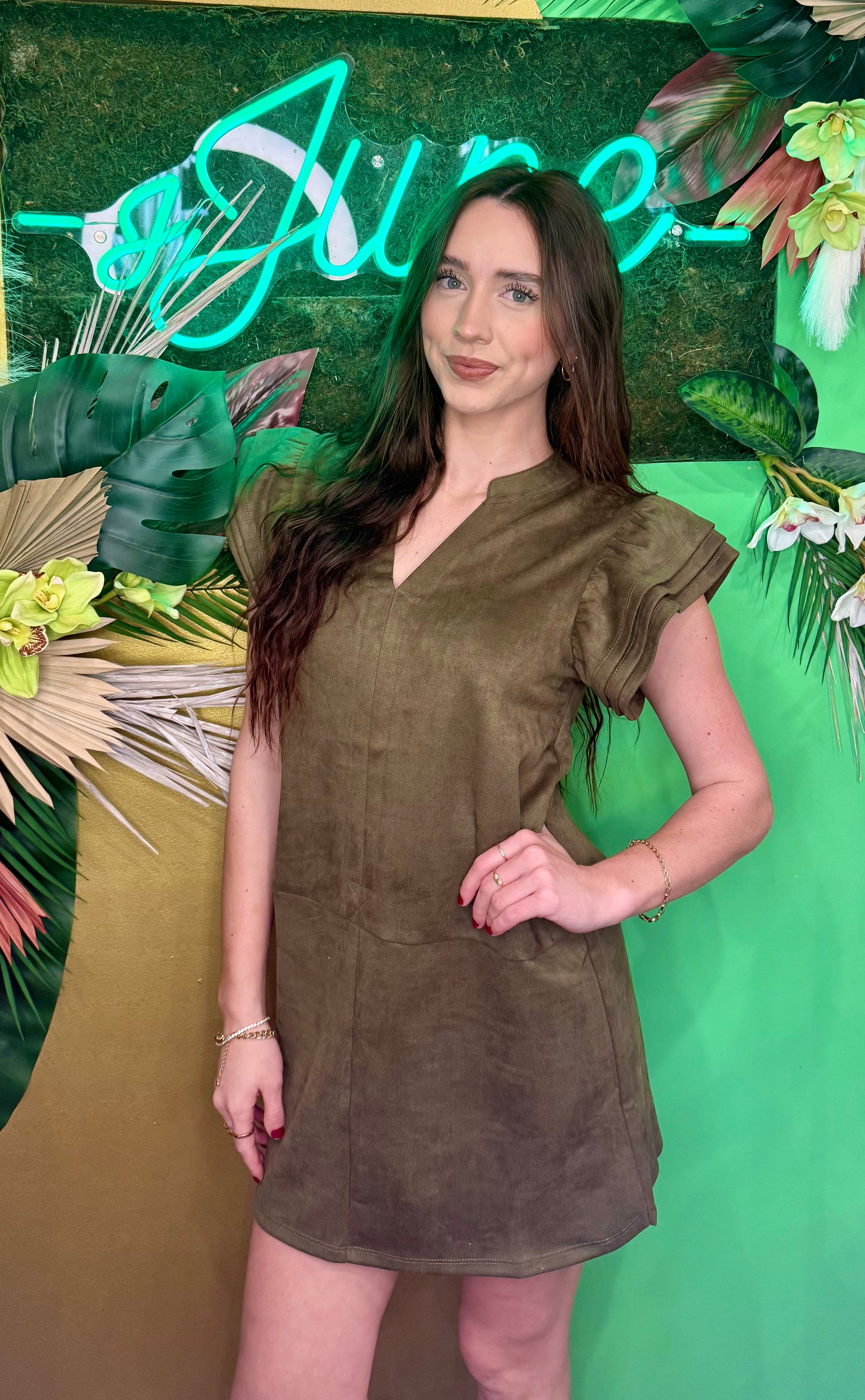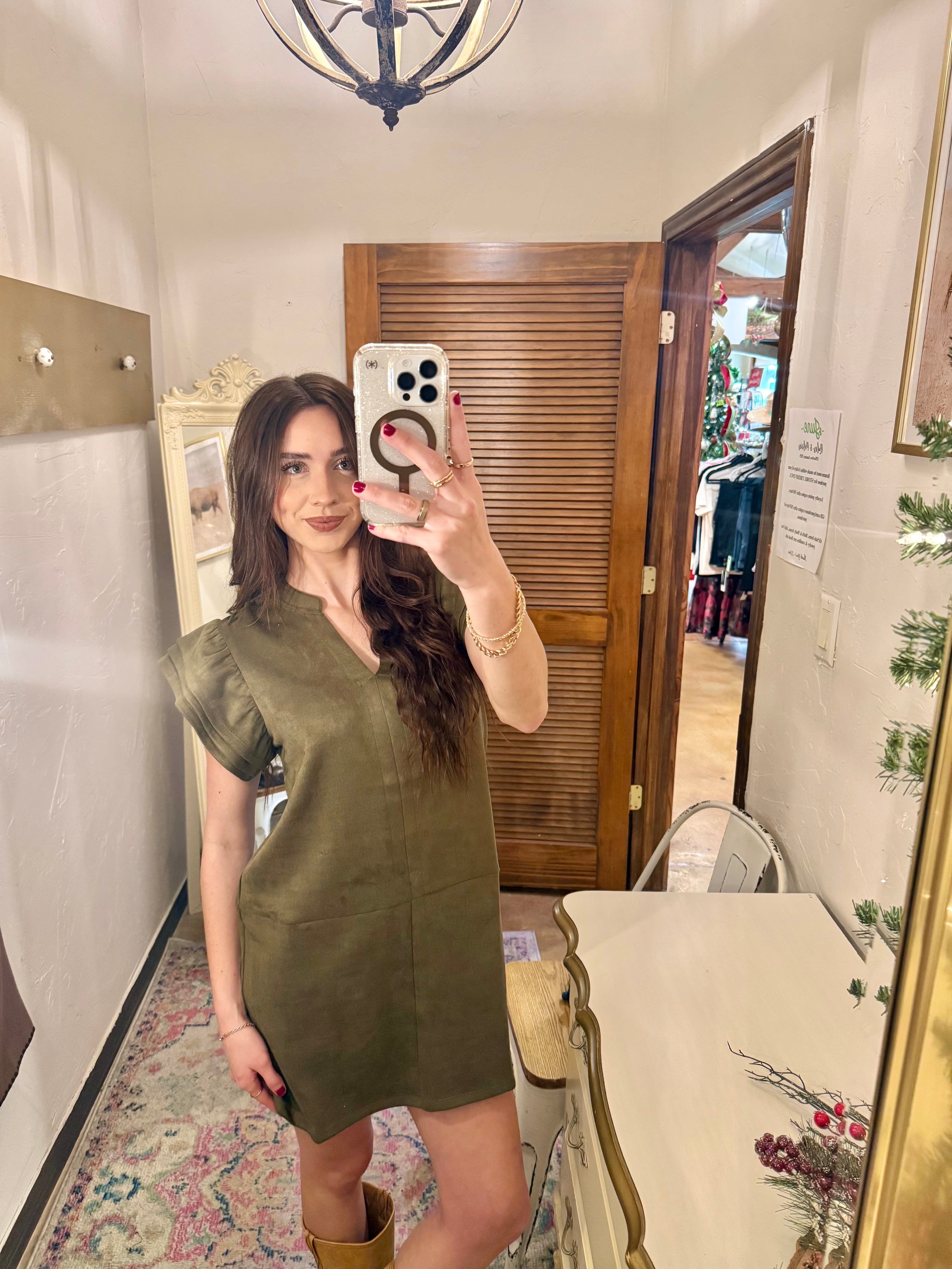 The Hannah Dress is your go-to piece for effortless elegance with a fun twist. This olive suede mini dress features a flattering V-neckline and playful flutter sleeves that add movement and charm to every step. The soft suede fabric drapes beautifully while keeping things cozy, making it perfect for date nights, brunch outings, or whenever you want to feel put-together without trying too hard. Dress it up with heels or keep it casual with sneakers—this versatile mini works either way.