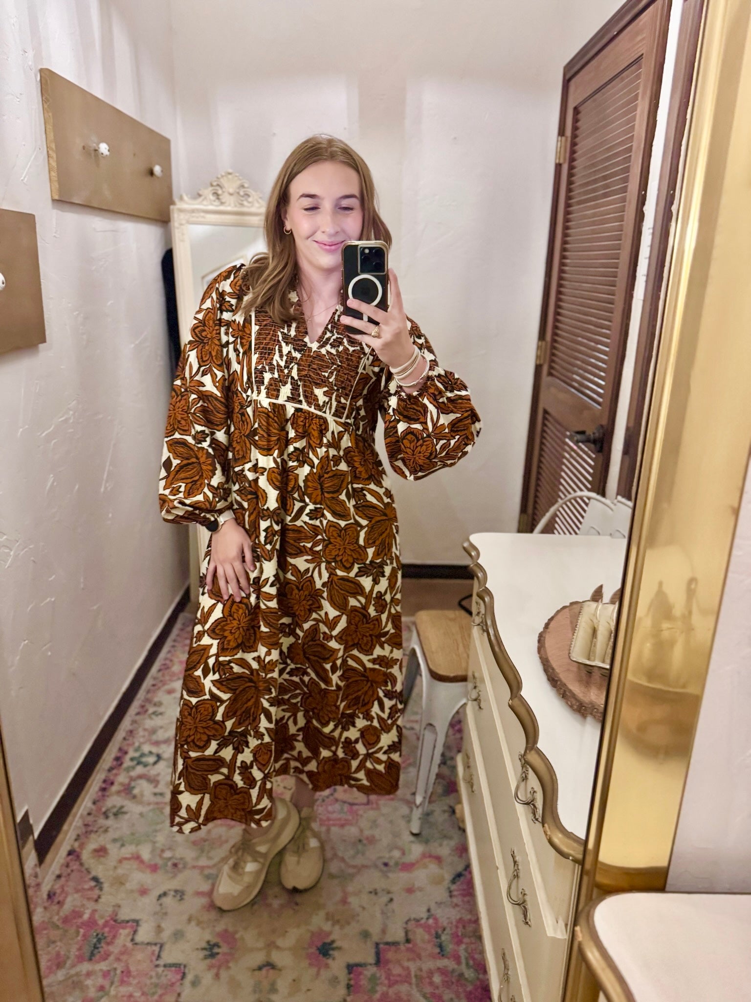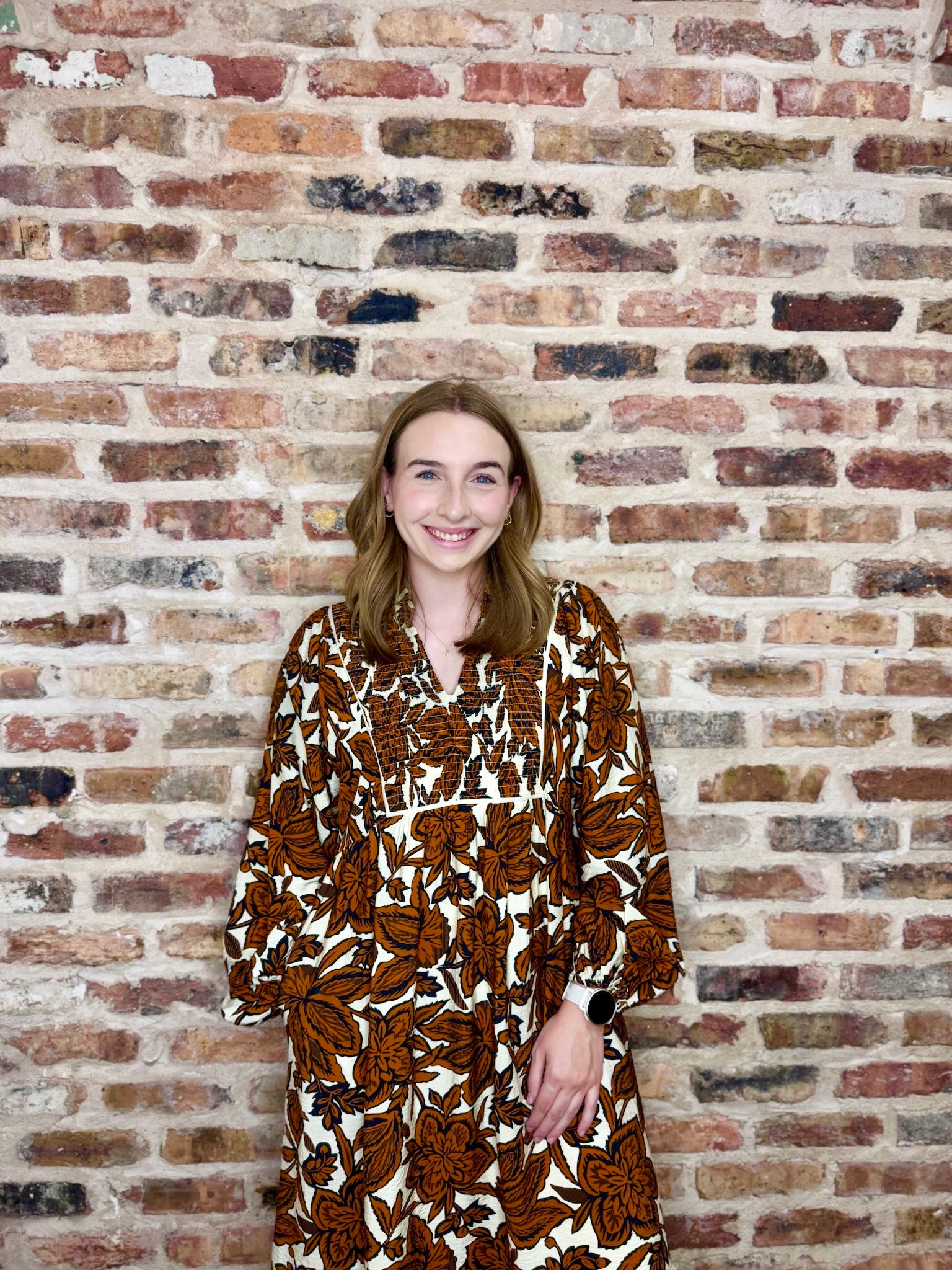 The Mckinley Dress brings cozy autumn vibes to your wardrobe with its flowing white fabric adorned in playful burnt orange florals. Featuring long sleeves and a charming collar, this dress gently cinches while keeping things comfy. Perfect for crisp fall days, it’s a whimsical choice that combines elegance with seasonal cheer. Slip into The Mckinley and twirl into fall with effortless style!
