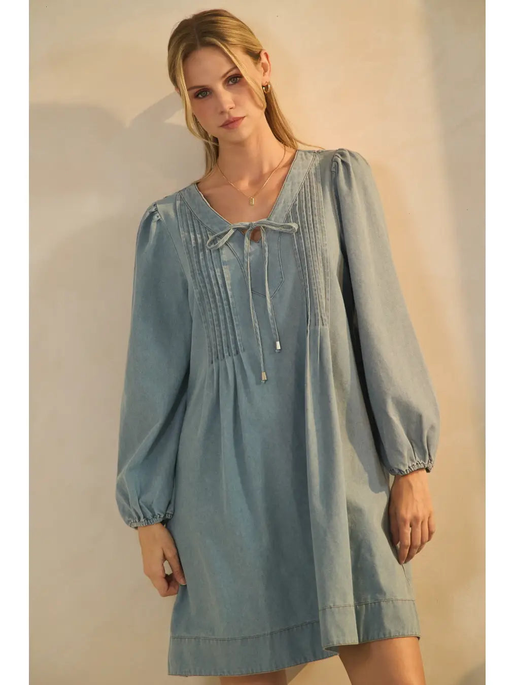 Embrace effortless style with this washed denim dress, designed to flatter every figure in extended sizes. The charming pintuck detailing down the front adds a touch of texture, while the playful tie necklace lets you adjust your look with a flirty twist. Perfect for day-to-night wear, this dress combines comfort and cool with a dash of sass.
