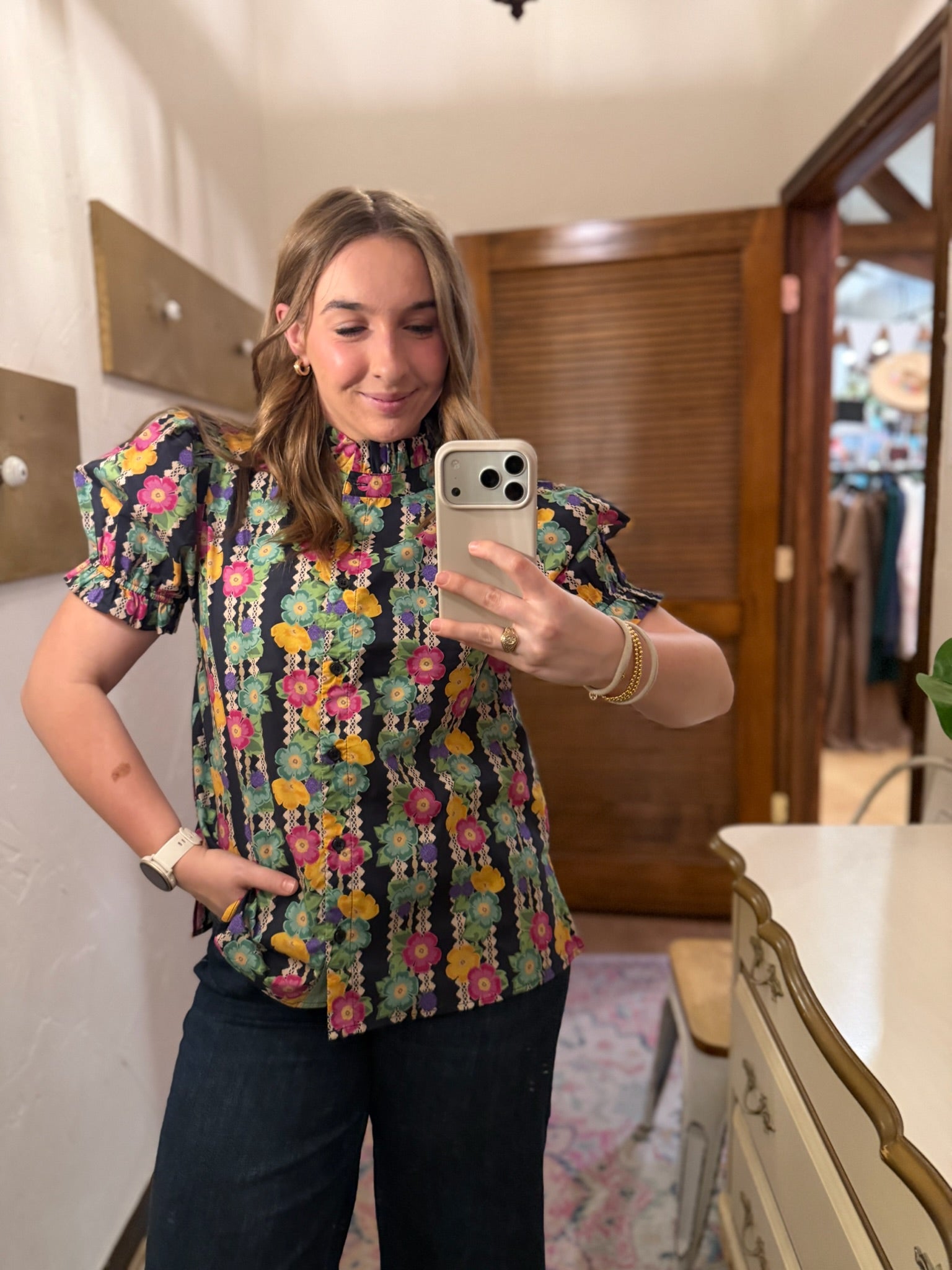 Elevate your spring wardrobe with the Frenchy Floral Top, a charming navy button-down featuring vibrant florals that run vertically down the front. The high neck collar and small puff sleeves add a touch of vintage-inspired elegance. Crafted to fit true to size, this versatile piece transitions seamlessly from casual days to dressed-up occasions. A timeless staple that brings effortless sophistication to any seasonal look.