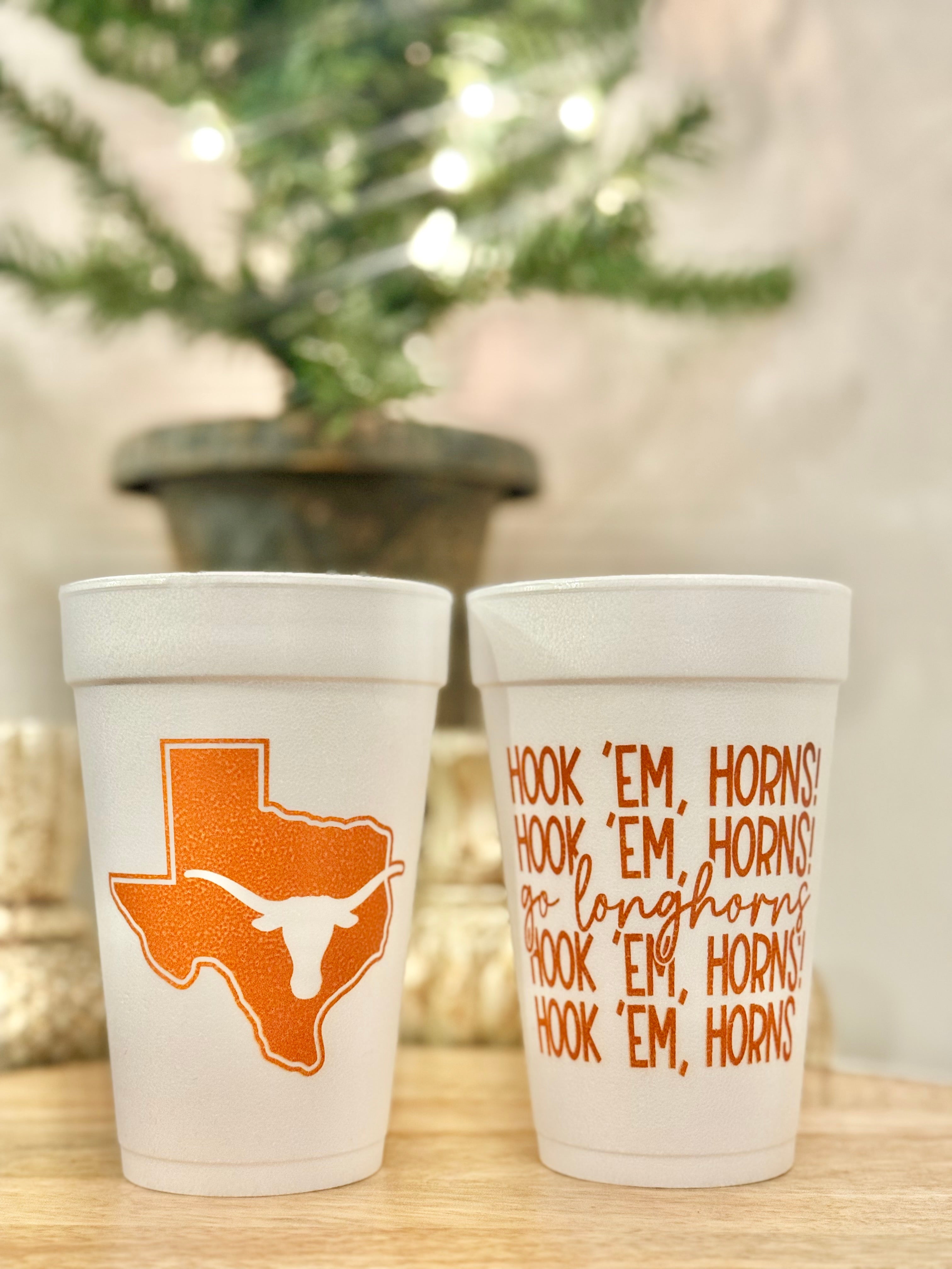 Show your Longhorn pride with every sip! This foam cup features the iconic longhorn logo and bold "Hook Em" lettering that'll have fellow fans cheering. Perfect for tailgates, game day parties, or showing your team spirit year-round. Lightweight and durable, it keeps your drink at the right temperature while you celebrate your favorite team. Go Horns!