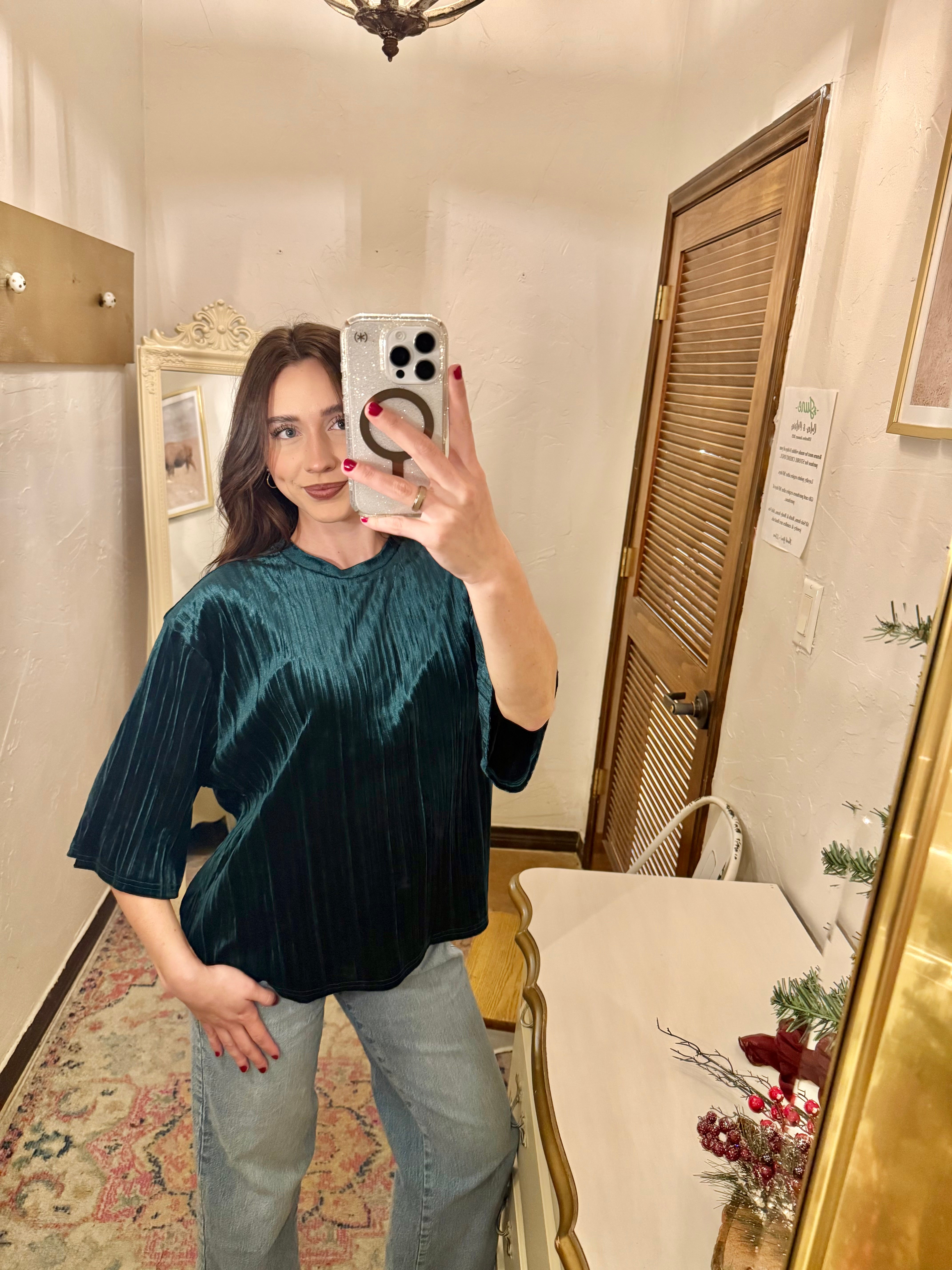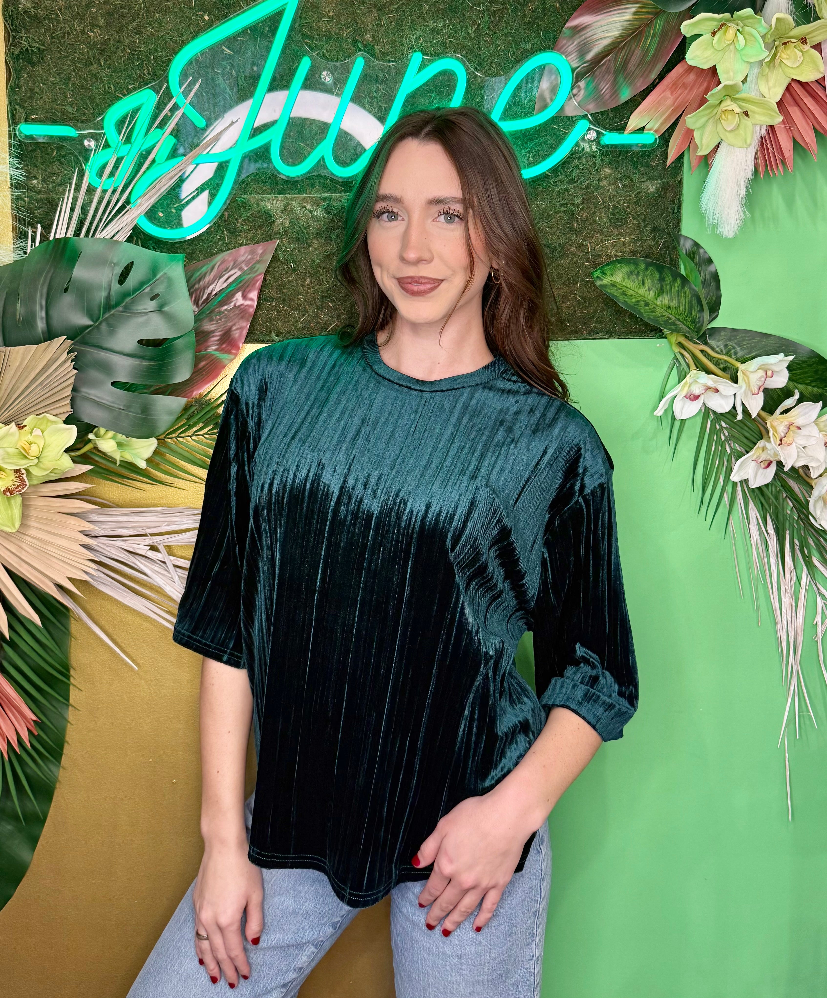 Elevate your wardrobe with The Jolly Blouse, a stunning pleated velvet creation in rich hunter green. This luxurious piece features elegant pleating that adds dimension and movement, while the sumptuous velvet fabric brings a touch of sophistication to any outfit. Perfect for dressing up or down, this blouse pairs beautifully with everything from tailored trousers to your favorite jeans. The deep, jewel-toned green flatters a variety of skin tones and works year-round. Whether you're heading to a special occasion or just want to feel fabulous on an ordinary day, this velvet beauty delivers instant polish and charm.