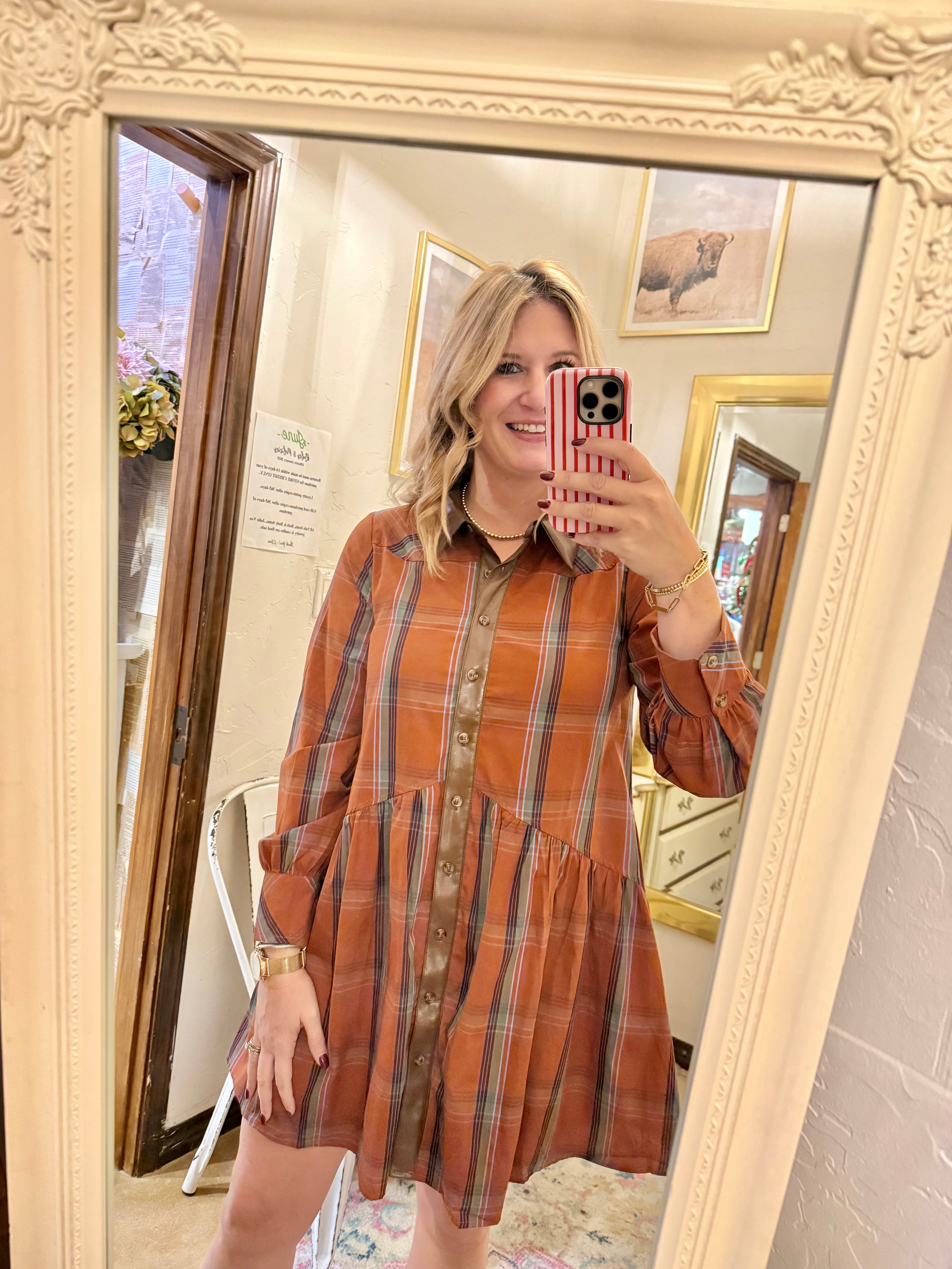 The Lizzy Dress brings timeless charm with a playful twist. This plaid contrast dress in rich rust tones features genuine leather accents—a statement button-up front and structured leather collar that elevate the classic silhouette. Perfect for mixing vintage vibes with modern edge, it's the kind of piece that works as hard at brunch as it does at dinner. Dress it up or down and watch heads turn.