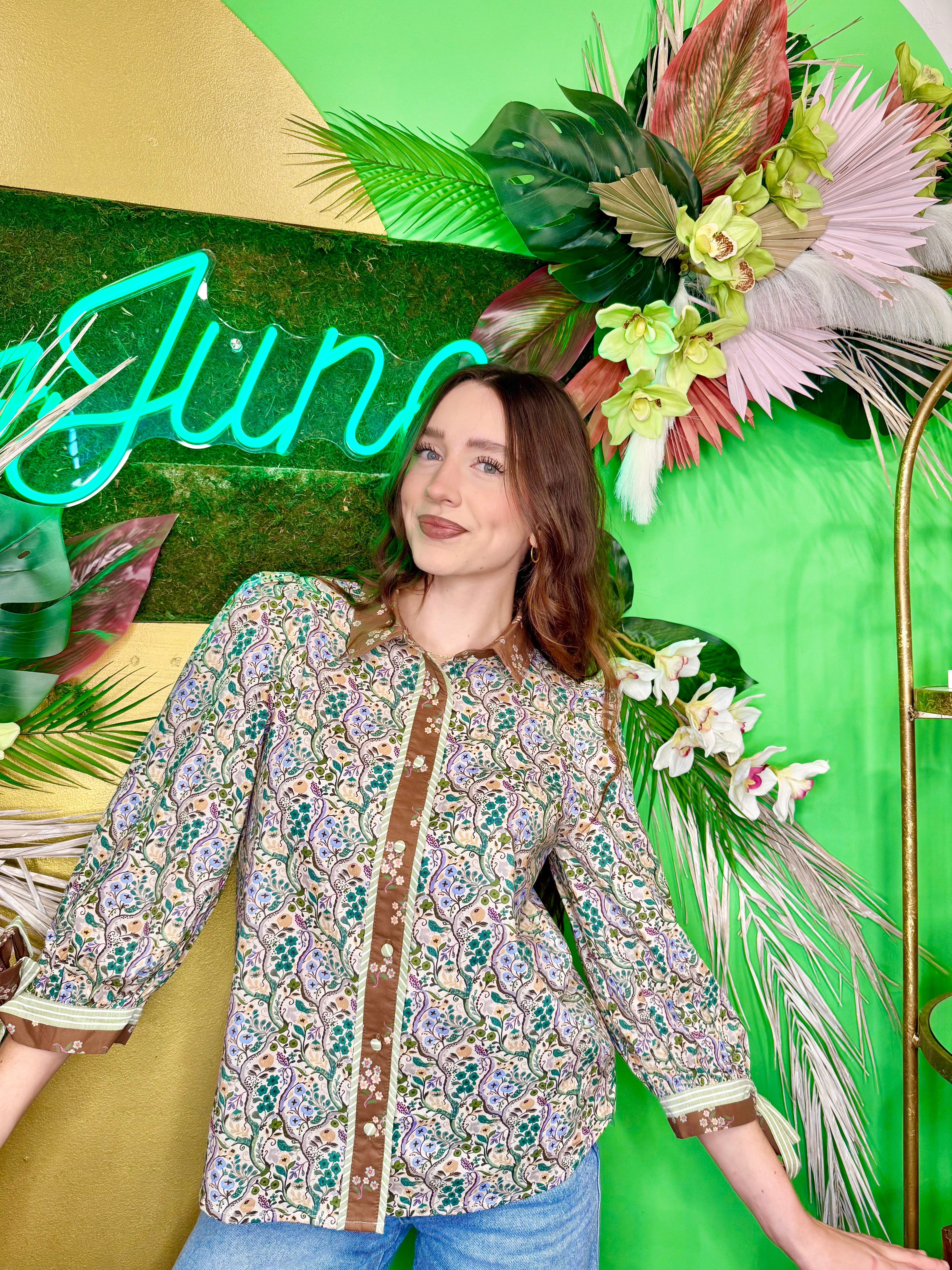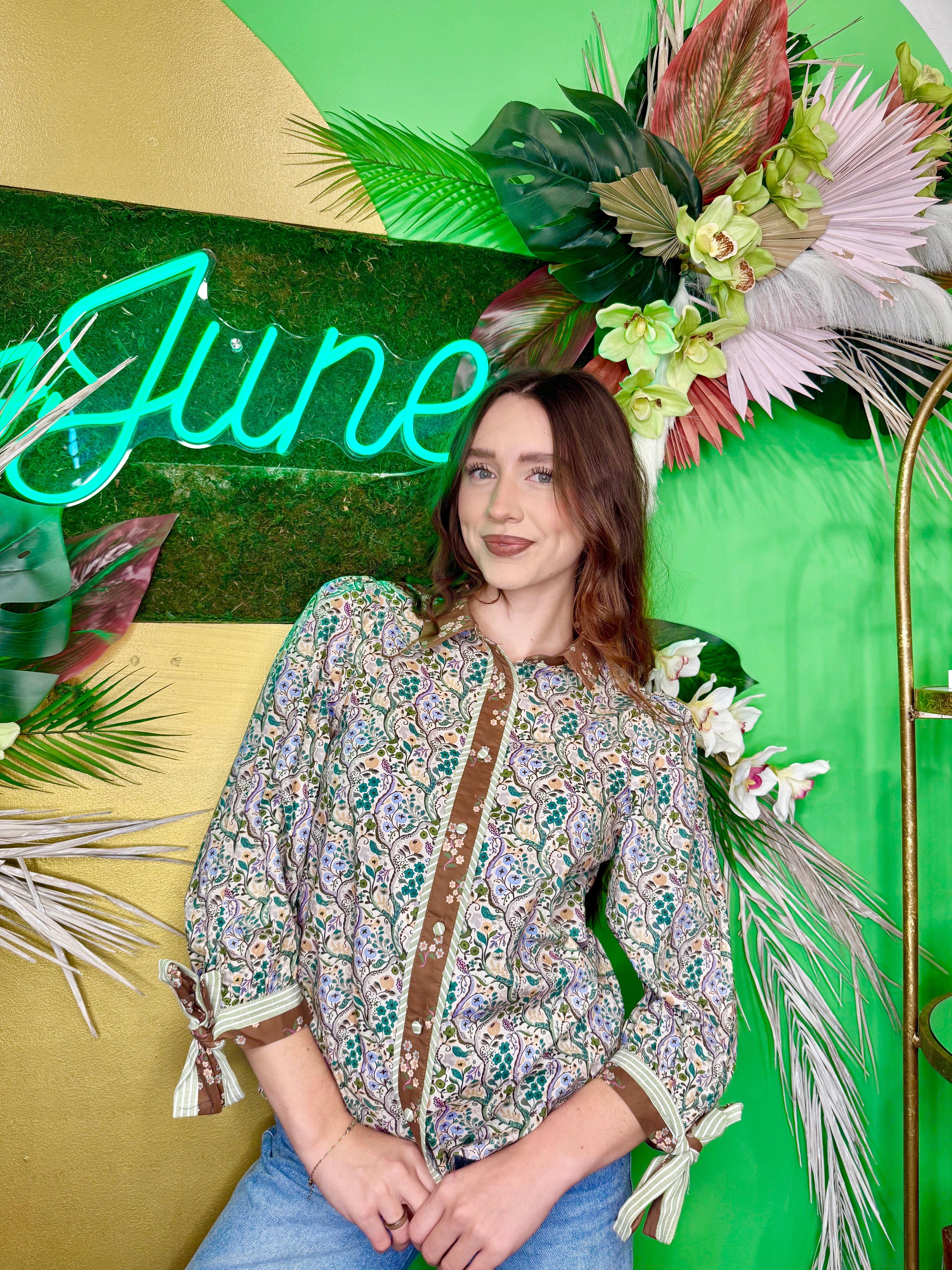 The Virginia Blouse is your new go-to for effortless charm. This multifloral beauty features a lush green base adorned with blooming florals, paired with a crisp brown collar that adds just the right amount of polish. Playful brown and green ties cinch the sleeves for a touch of whimsy, while full button-front closure gives you complete control over your look. Perfect for layering or wearing solo, this blouse brings garden-fresh style to any outfit.