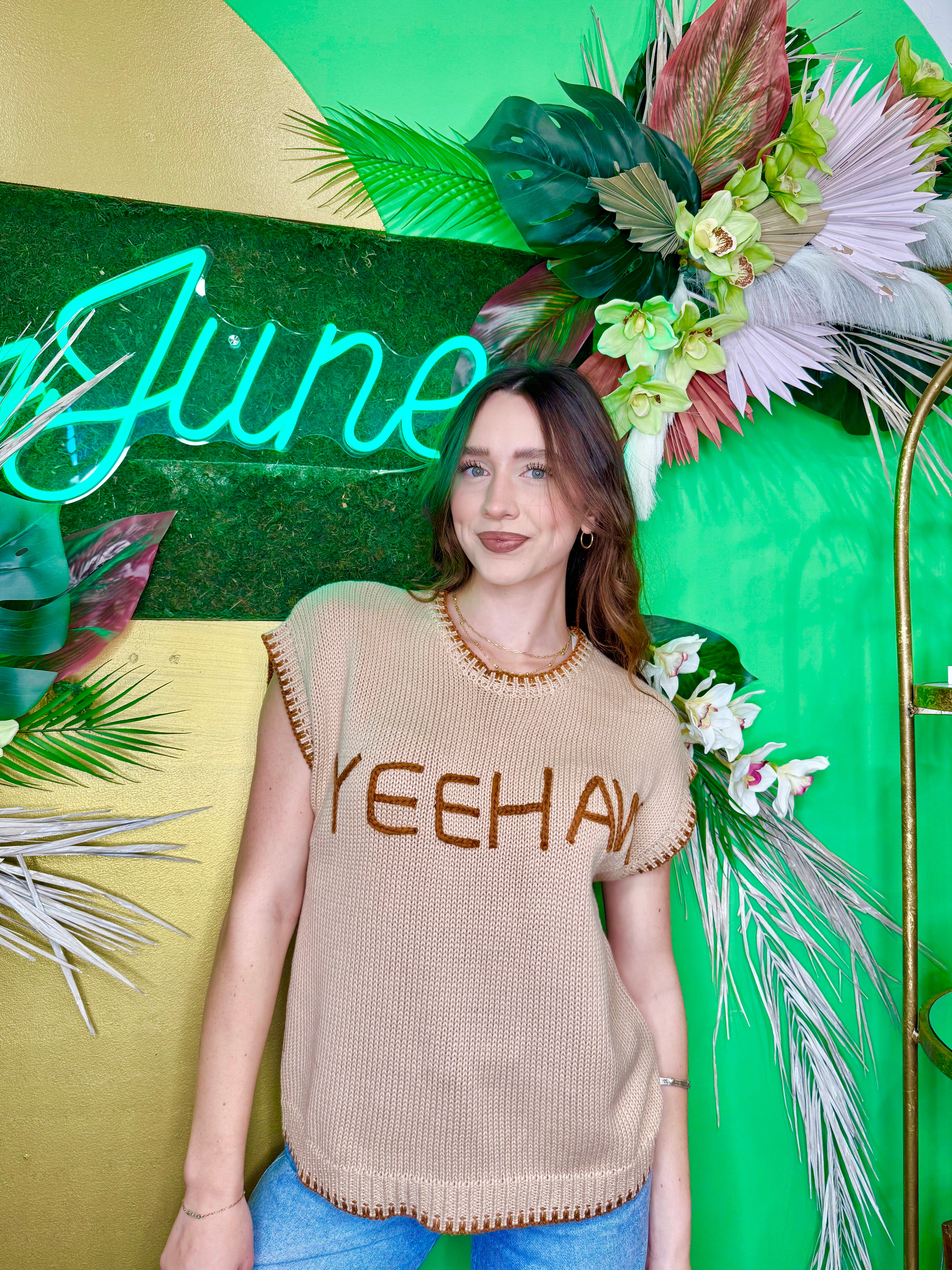 Saddle up in style with this fun tan and camel short sleeve knit sweater featuring a bold "Yeehaw" design stitched across the front. Perfect for showing off your spirited side, this cozy knit keeps things casual and comfortable while making a playful statement. Whether you're heading to a rodeo-themed party or just want to add some Western charm to your everyday look, this sweater delivers personality with every wear.