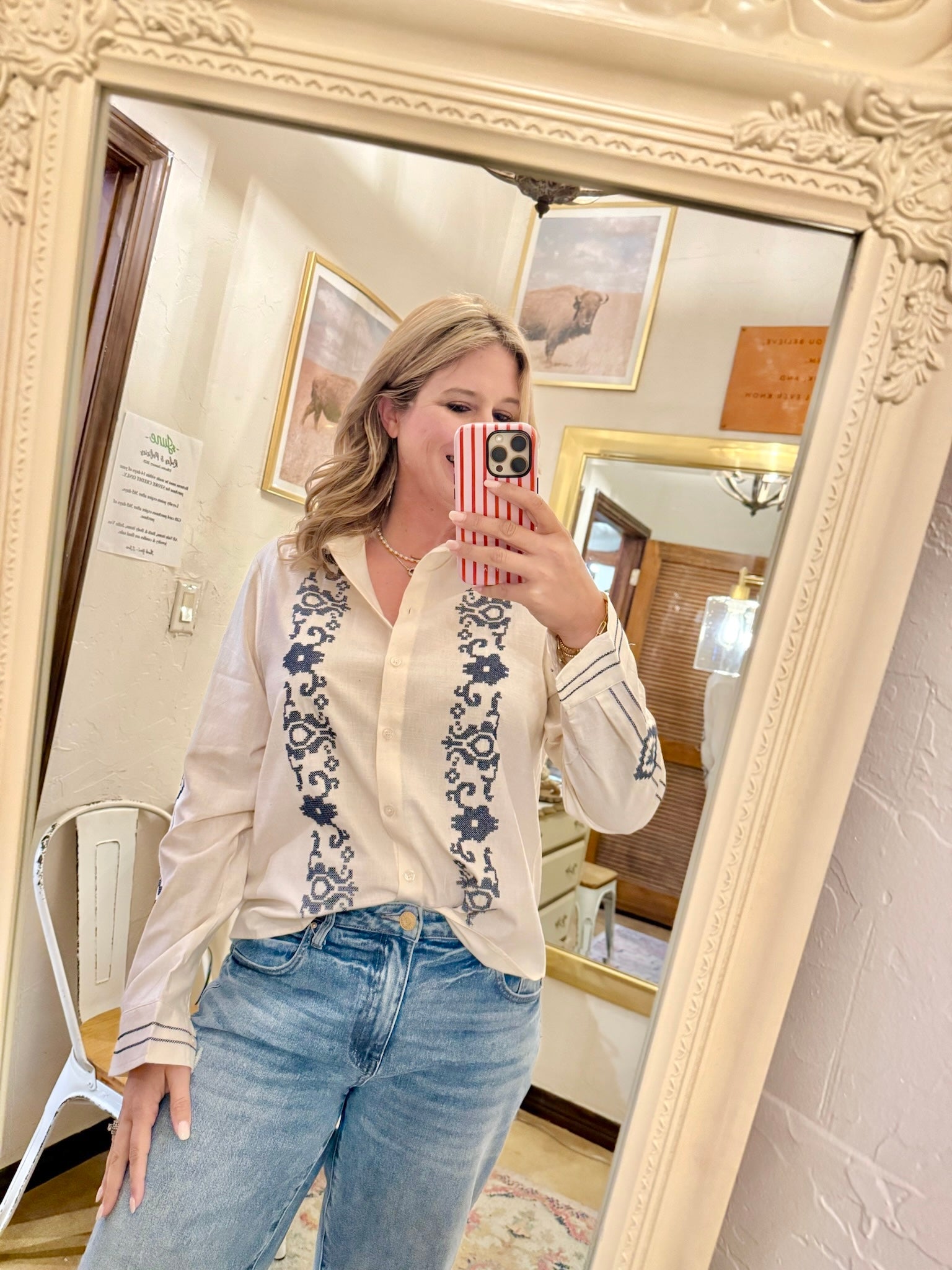 The Carmen Blouse is your new go-to for effortless elegance. This light cream long-sleeve button-up features charming navy embroidered details that add just the right amount of personality without trying too hard. Perfect for dressing up your everyday look or keeping things casual—pair it with your favorite jeans or tuck it into a skirt for instant polish. A timeless piece that works as hard as you do.