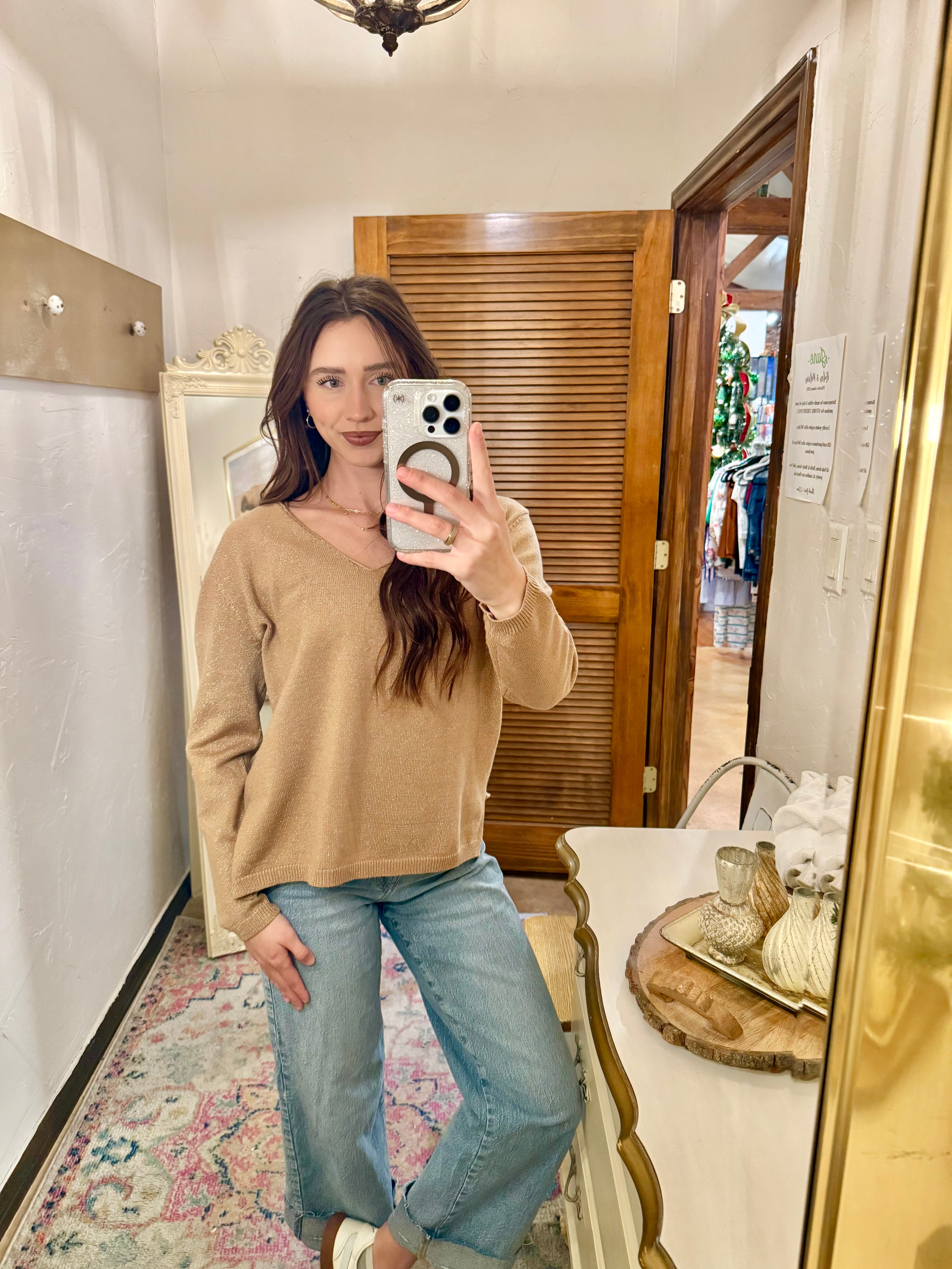 Shimmer into the spotlight with The Goldie Blouse, your new go-to for effortless glamour. This long sleeve beauty features a luxurious golden beige base adorned with eye-catching glitter that catches the light with every move. Perfect for elevating your everyday look or turning heads at special occasions, this blouse pairs beautifully with everything from tailored trousers to your favorite jeans.
