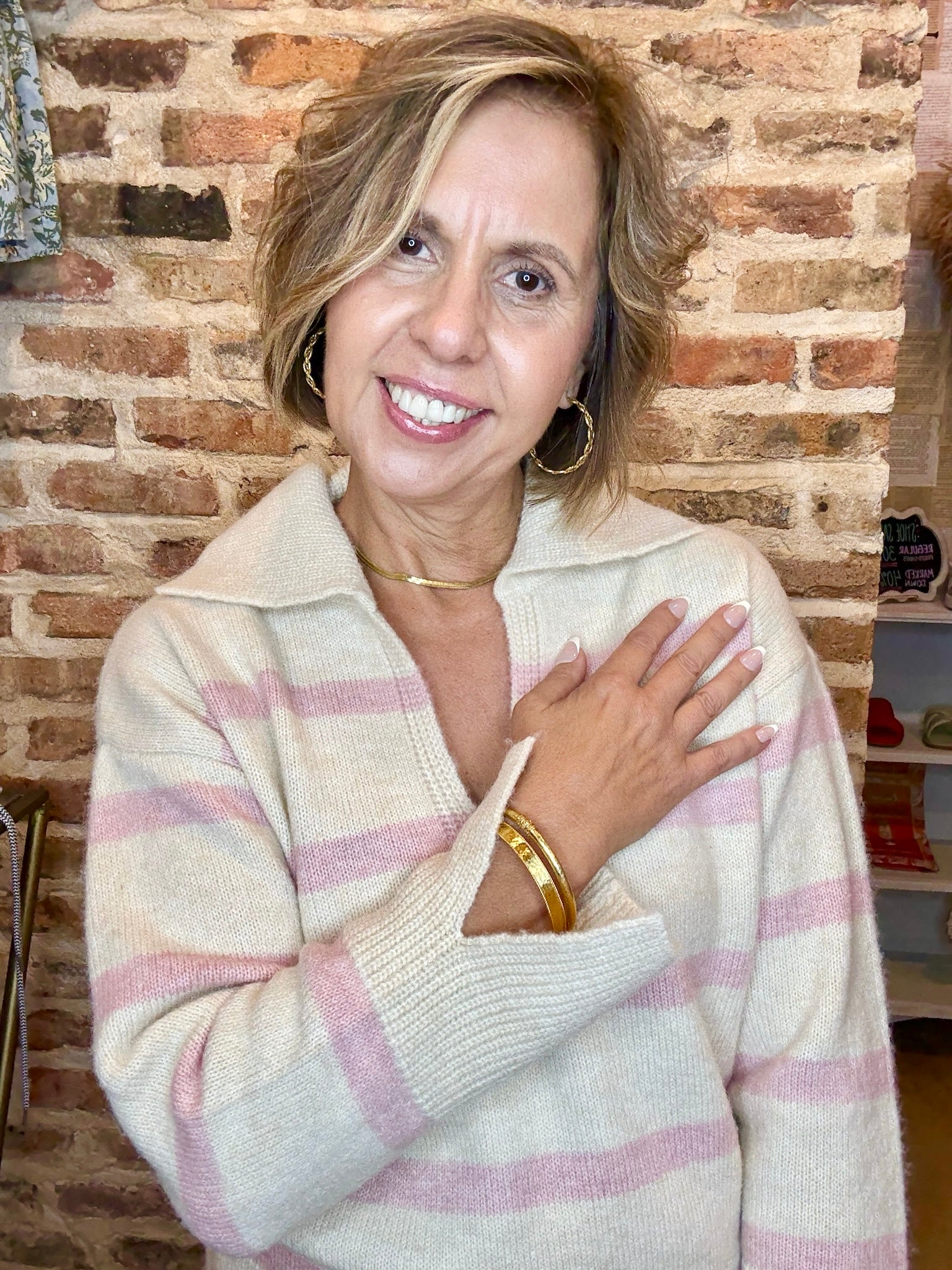 The Parker Sweater wraps you in cozy softness with its off-white base and bold, thick pink stripes that add a fun pop of color. Crafted from a luxuriously soft material and featuring a snug collar, it’s perfect for playful layering and chilly days that call for comfy style. Stay warm and bright with this charming sweater that’s as cheerful as it is comfy.