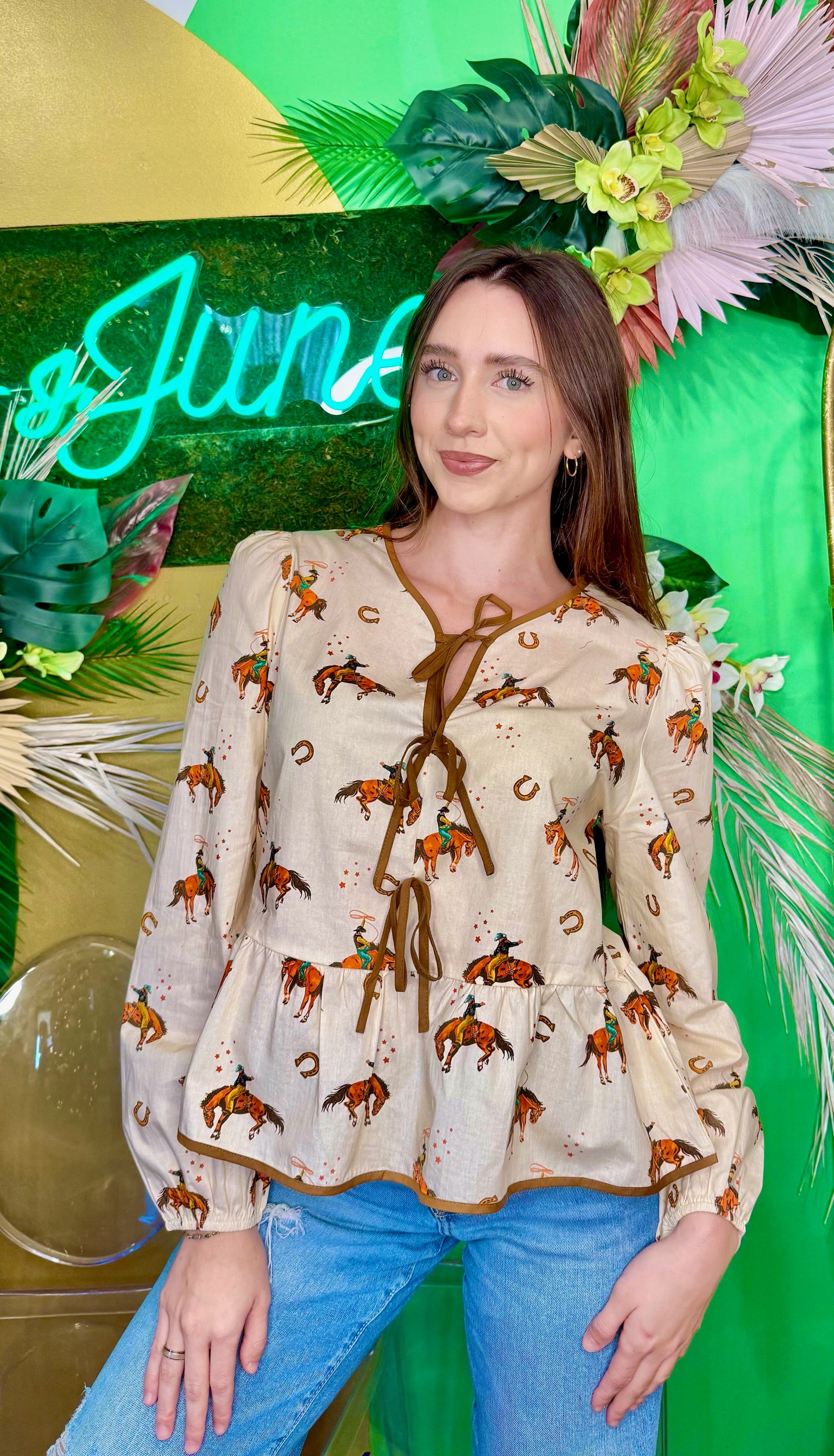The Skylar Top brings Western flair to your everyday wardrobe with its eye-catching rodeo-inspired print. Featuring a bareback rider, horseshoes, and bold red stars, this tied top captures that spirited cowgirl energy. Perfect for anyone who loves a touch of rodeo charm with a fun, laid-back vibe. Tie it up and saddle up for style that stands out.