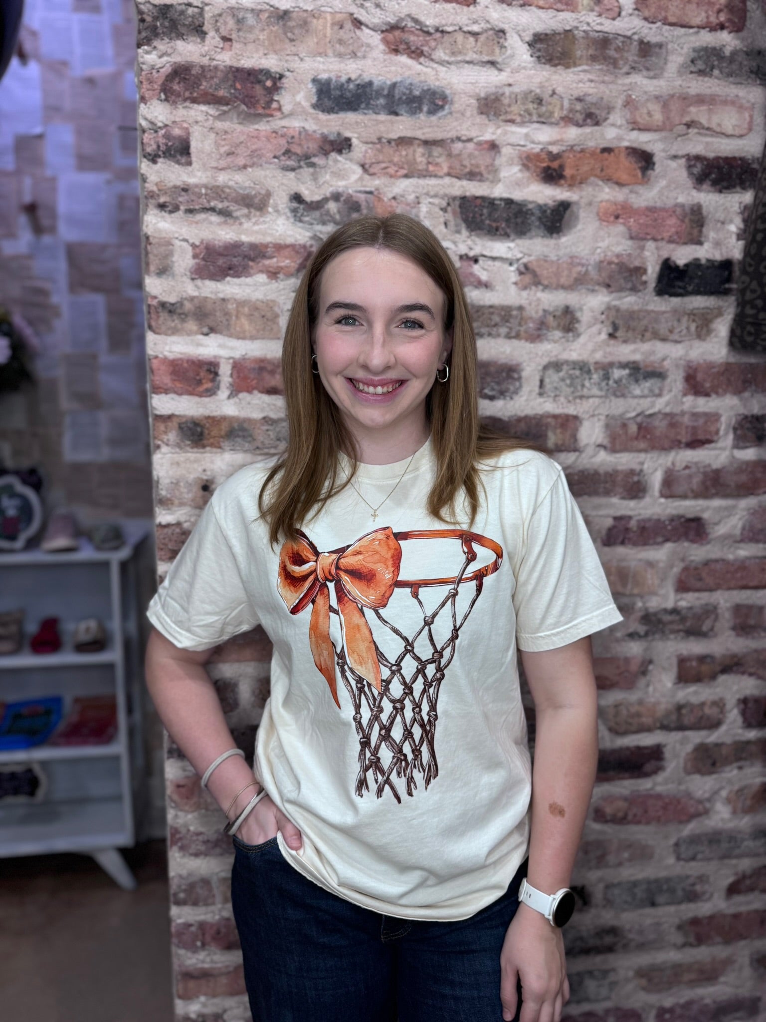 Shoot some style with this playful tee featuring a bold basketball hoop graphic paired with a cheerful orange bow. Perfect for court enthusiasts and fashion lovers alike, this casual piece brings a fun twist to game day looks or everyday wear. The eye-catching design makes it an instant conversation starter that celebrates your love for hoops with a touch of whimsy.