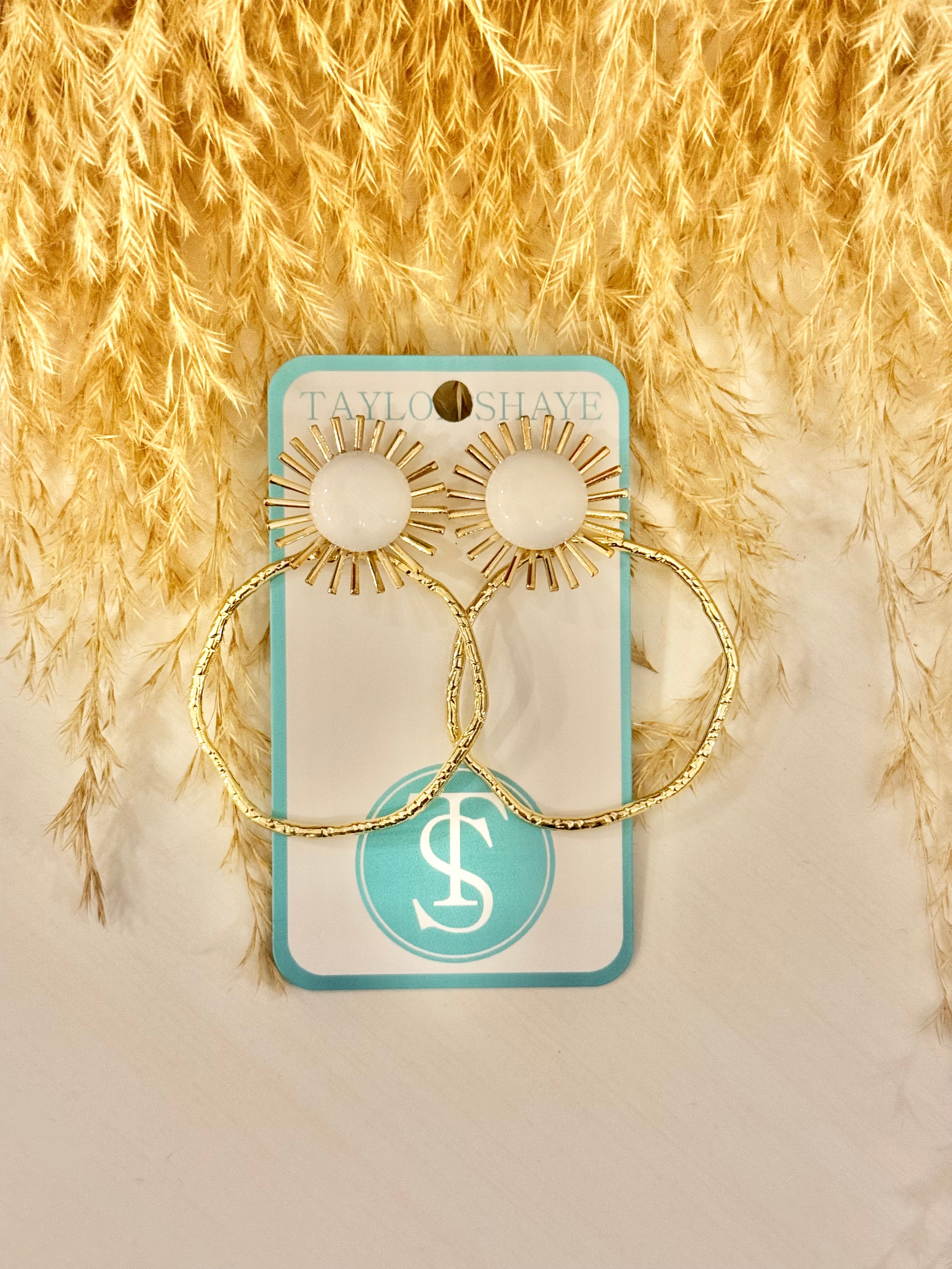 Catch the light and turn heads with these stunning Sunburst Hoops! Each piece features a gleaming white pendant adorned with a radiant sunburst design that radiates outward like golden rays. Perfect for adding a touch of celestial charm to any outfit, these hoops bring playful energy and eye-catching style to your everyday look. Whether you're dressing up or keeping it casual, these beauties spark conversation and shine bright. Let your inner light shine through!