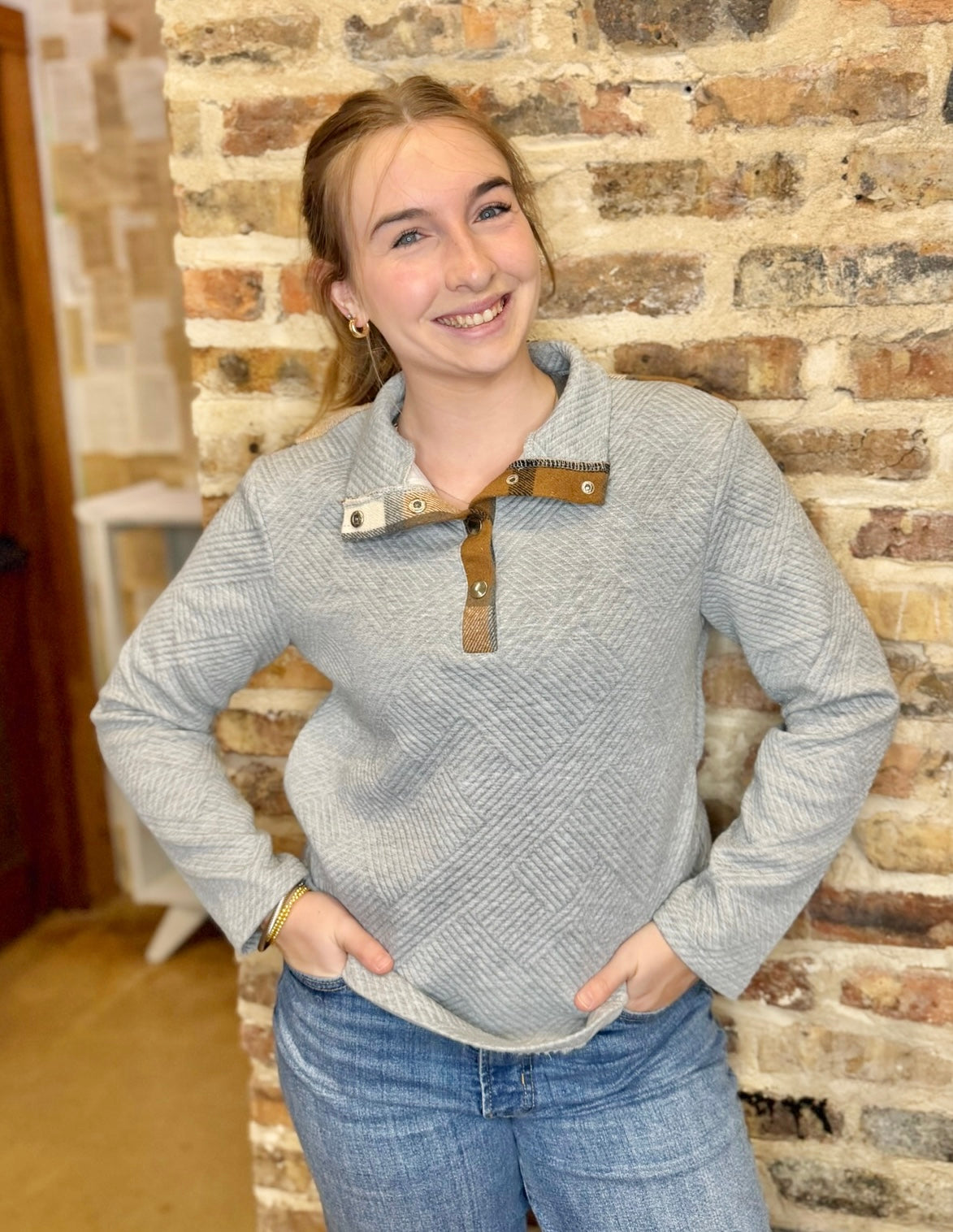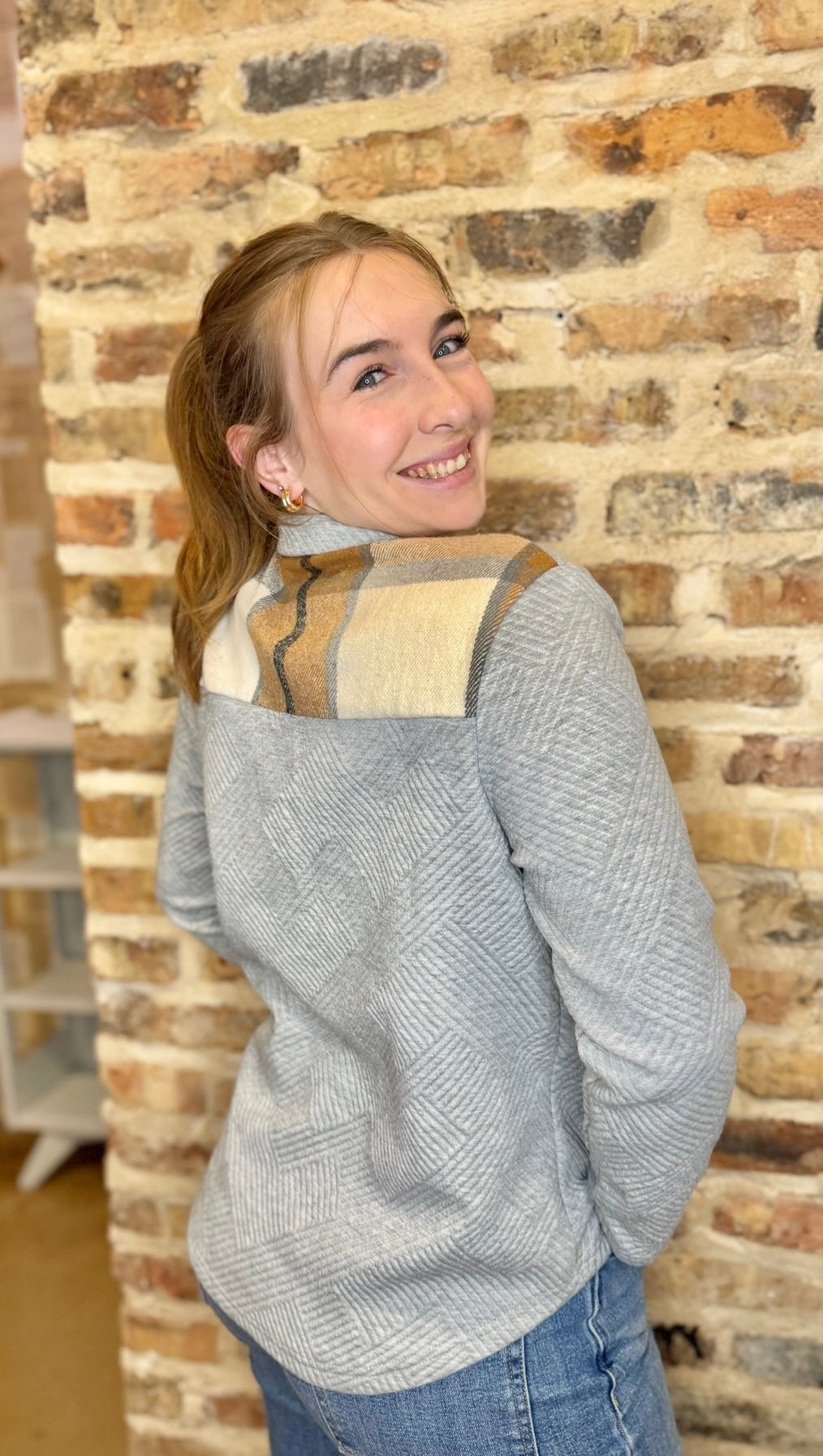 The Annette Blouse is your new go-to for effortless layering and cozy vibes. This long sleeve sweater blouse features a sleek grey front with a delightful surprise—a warm fall-colored checkered pattern adorning the back. The half button closure makes it perfect for adjusting your comfort level throughout the day, whether you're buttoning up for the office or leaving it open over a favorite tee. Versatile, charming, and just the right amount of playful pattern mixing.