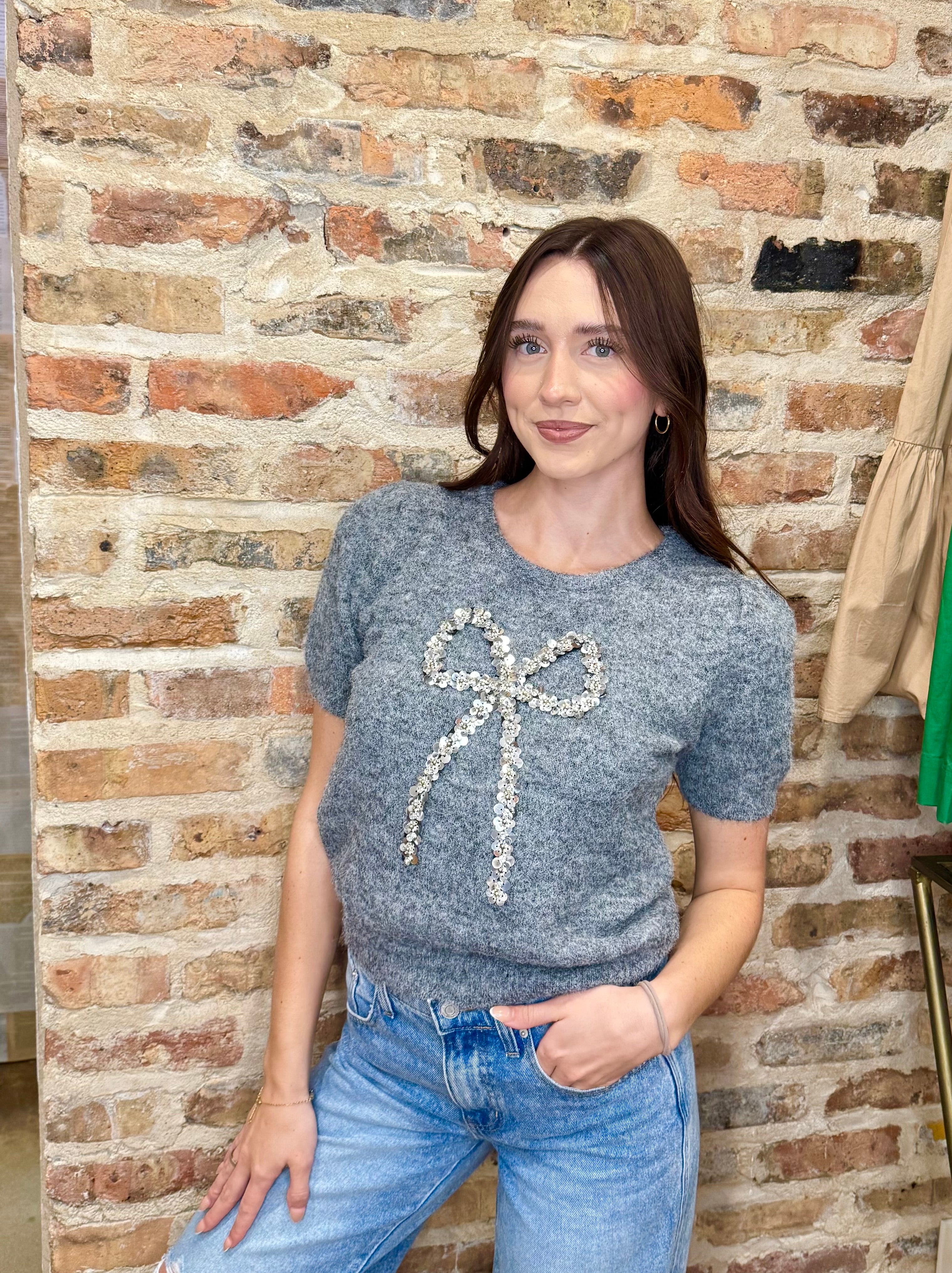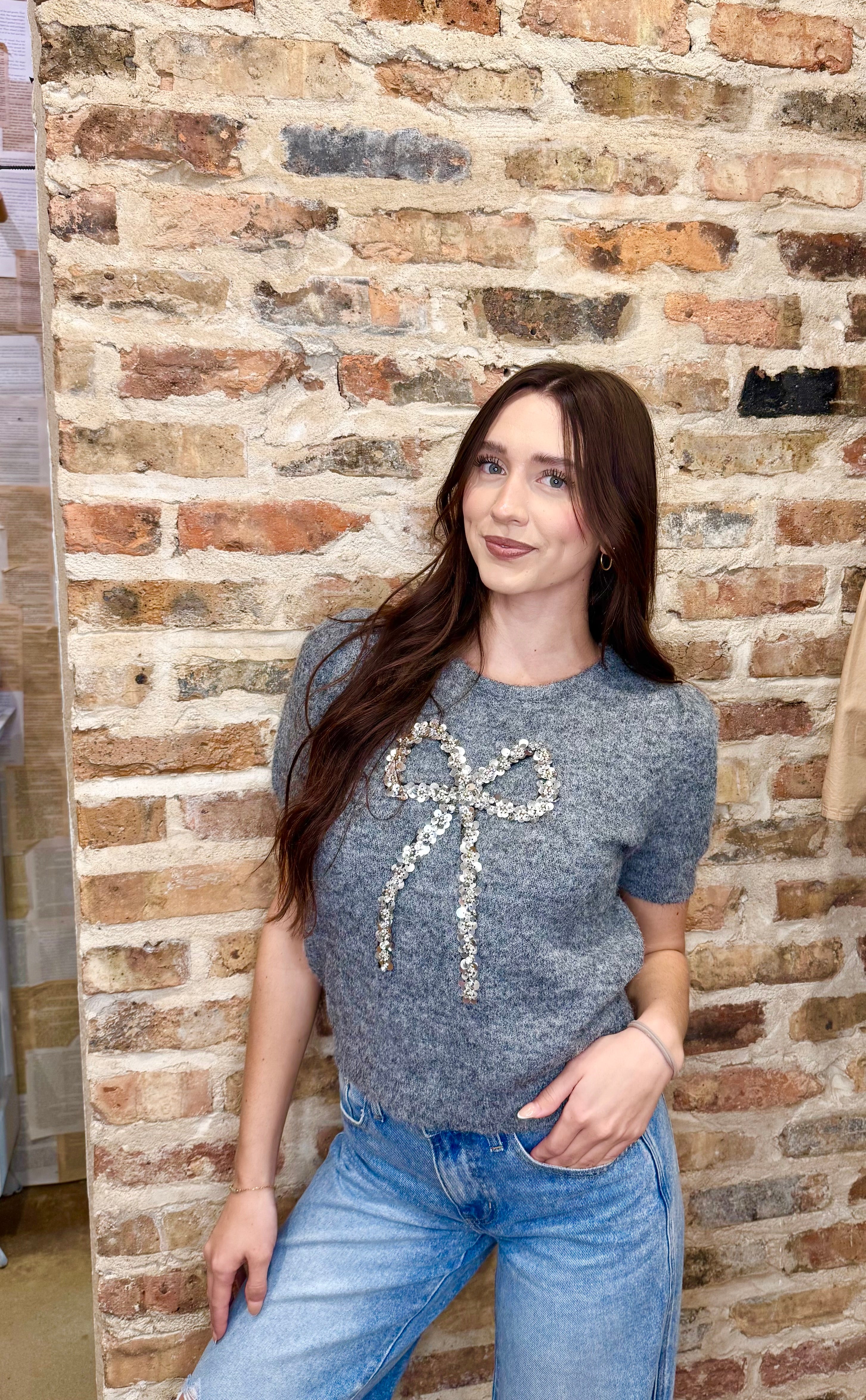 The Leigh Sweater brings a fun twist to cozy style with its ash dark grey shade and short sleeves, perfect for layering or warming up on mild days. A sparkly bow right in the middle adds a cheeky touch of shine that brightens up any outfit. Playful yet practical, this sweater is ready to become your new favorite go-to for casual days full of charm.